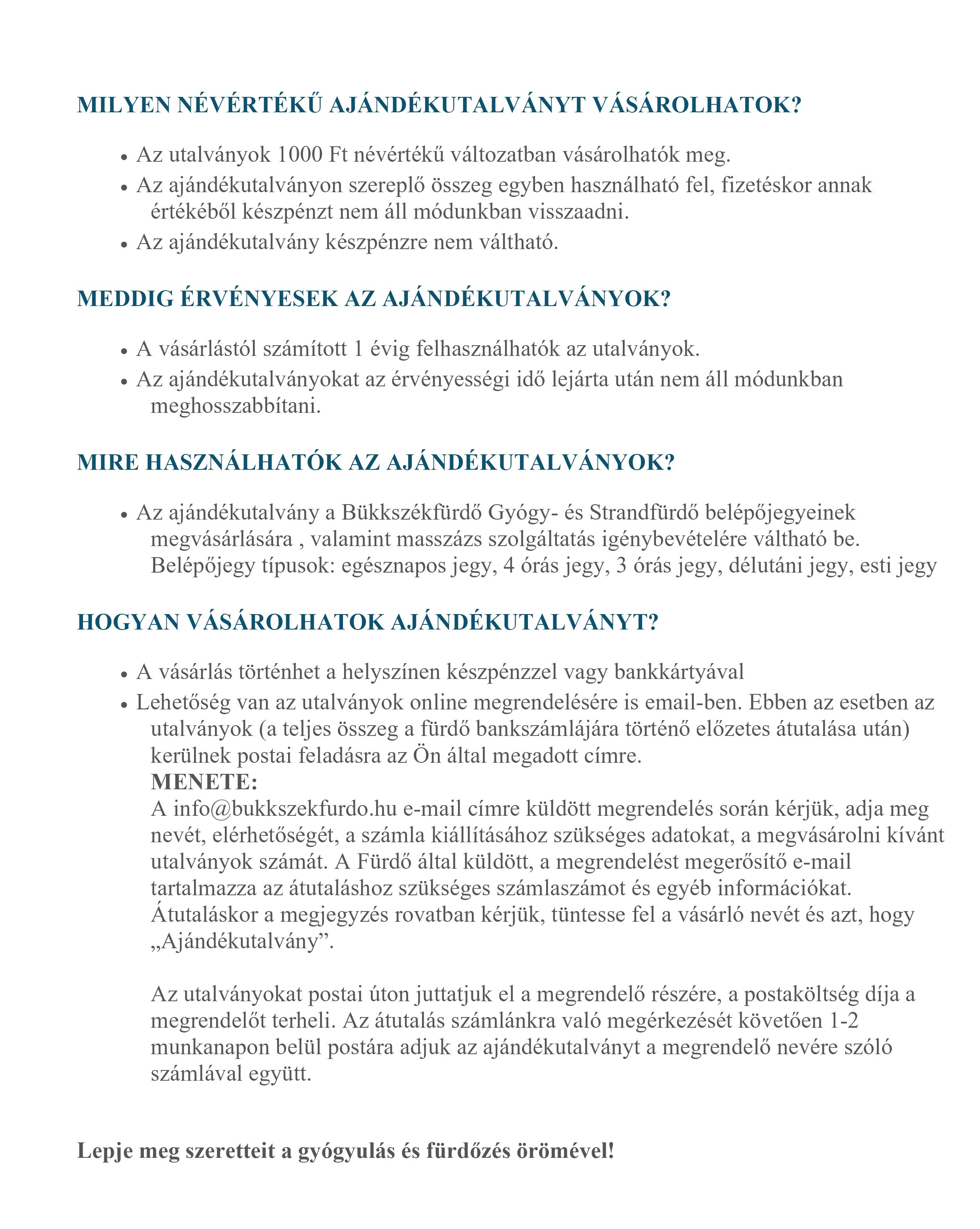 A Bükkszékfürdő Gyógy- és Strandfürdő praktikus ajándékutalványai minden korosztály számára tökéletes megoldást jelentenek egész évben, legyen szó születésnapról, karácsonyról, nyugdjíba vonulási ajándékról, vagy bármilyen jelentős évfordulóról!